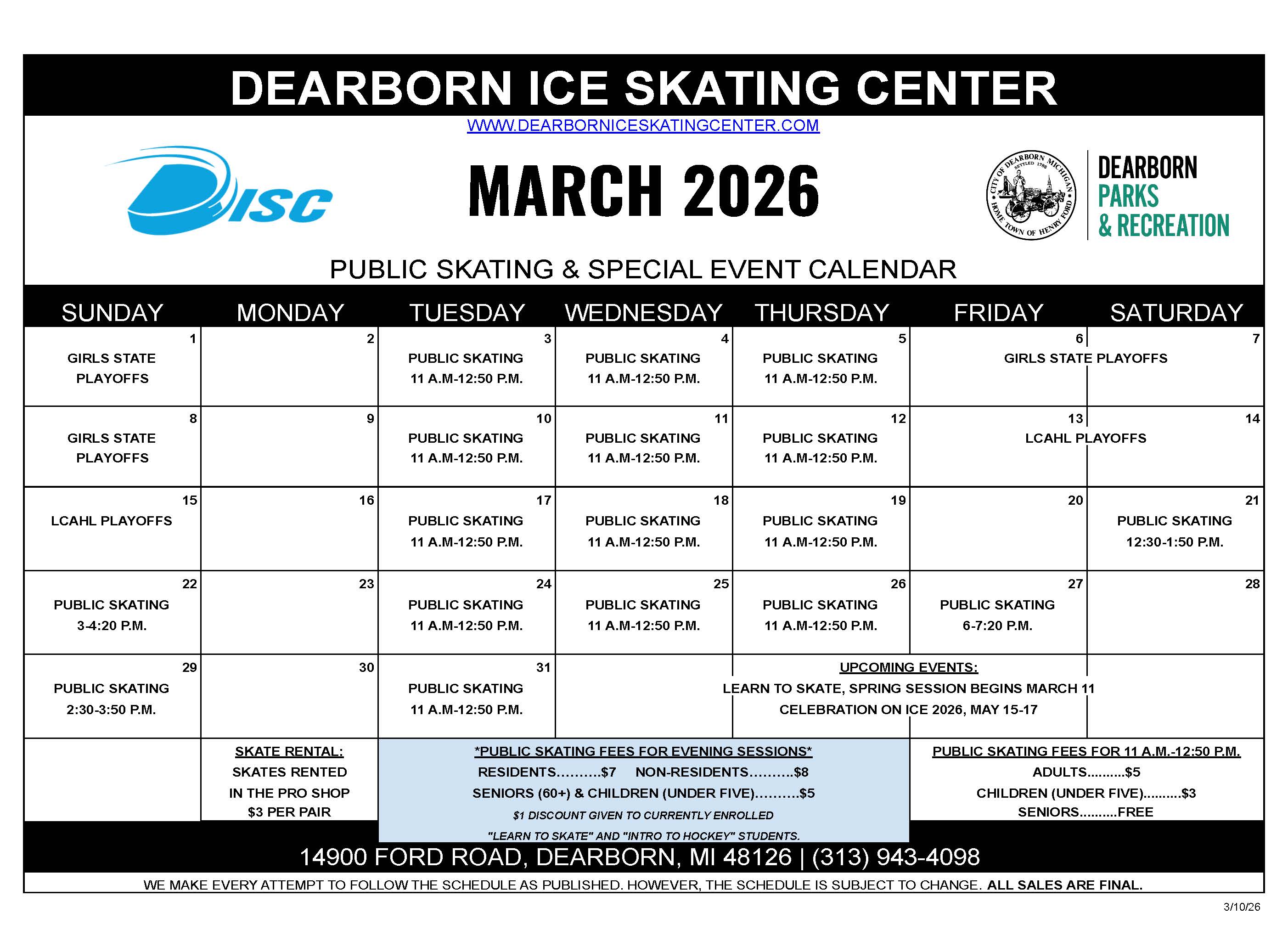 March Public Skating Calendar