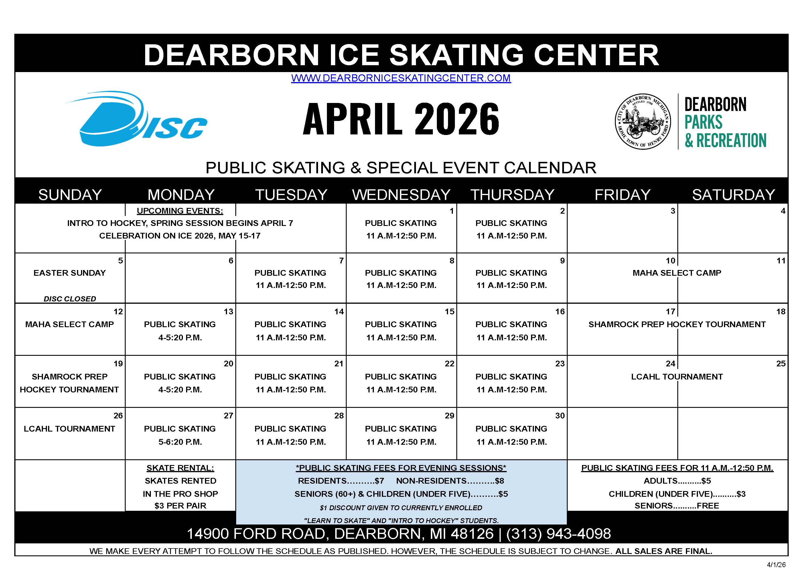 April Public Skating Calendar